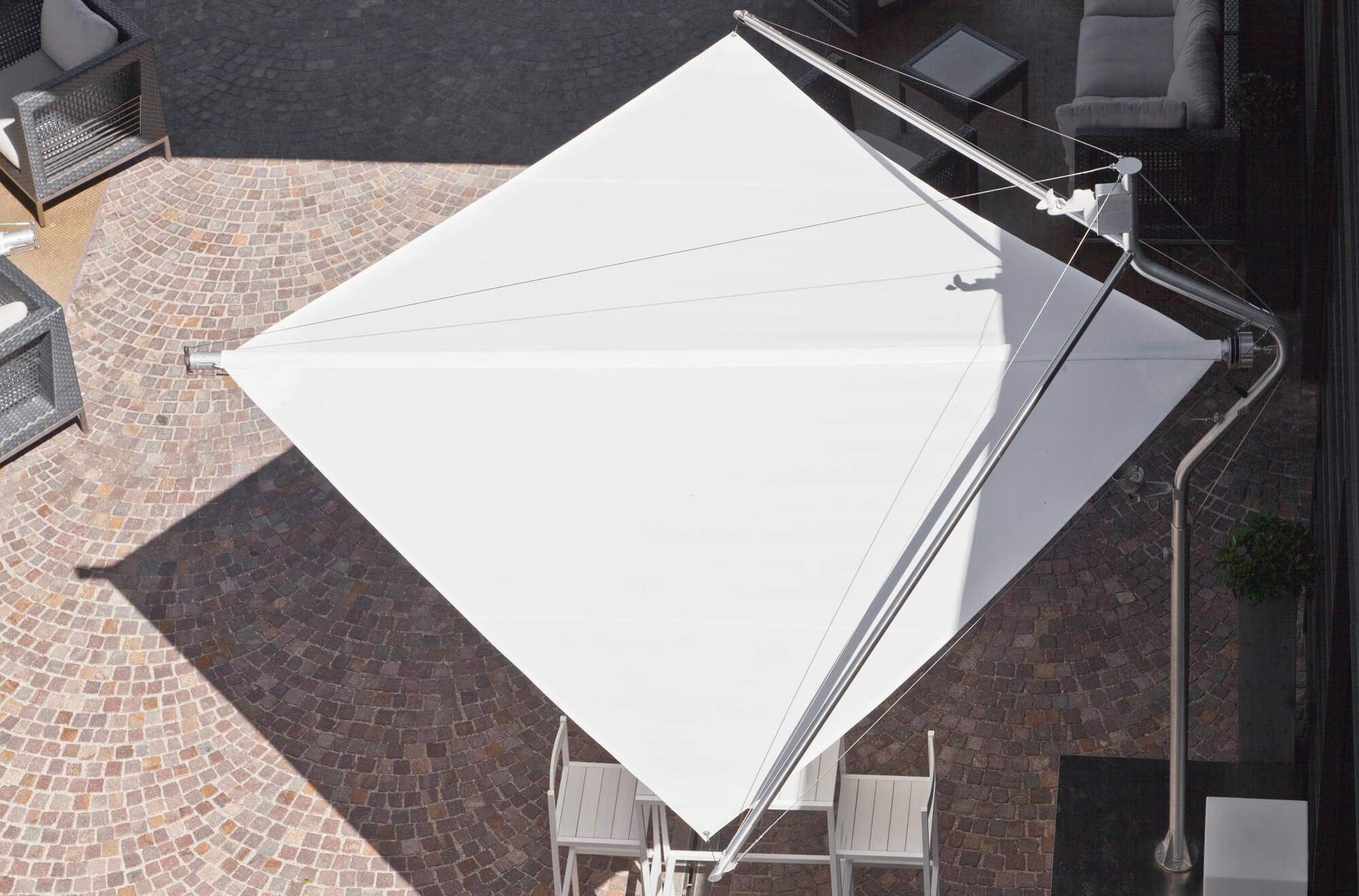 Ein eleganter Sonnensegelschirm im minimalistischen Design. Kann überall leicht positioniert werden, spendet kühlen Schatten und ist ein wahrer Blickfang auf jeder Terrasse. Die optionalen Designstrahler sorgen in den Abendstunden für eine angenehme, indirekte Beleuchtung und setzen das Segel gekonnt in Szene.